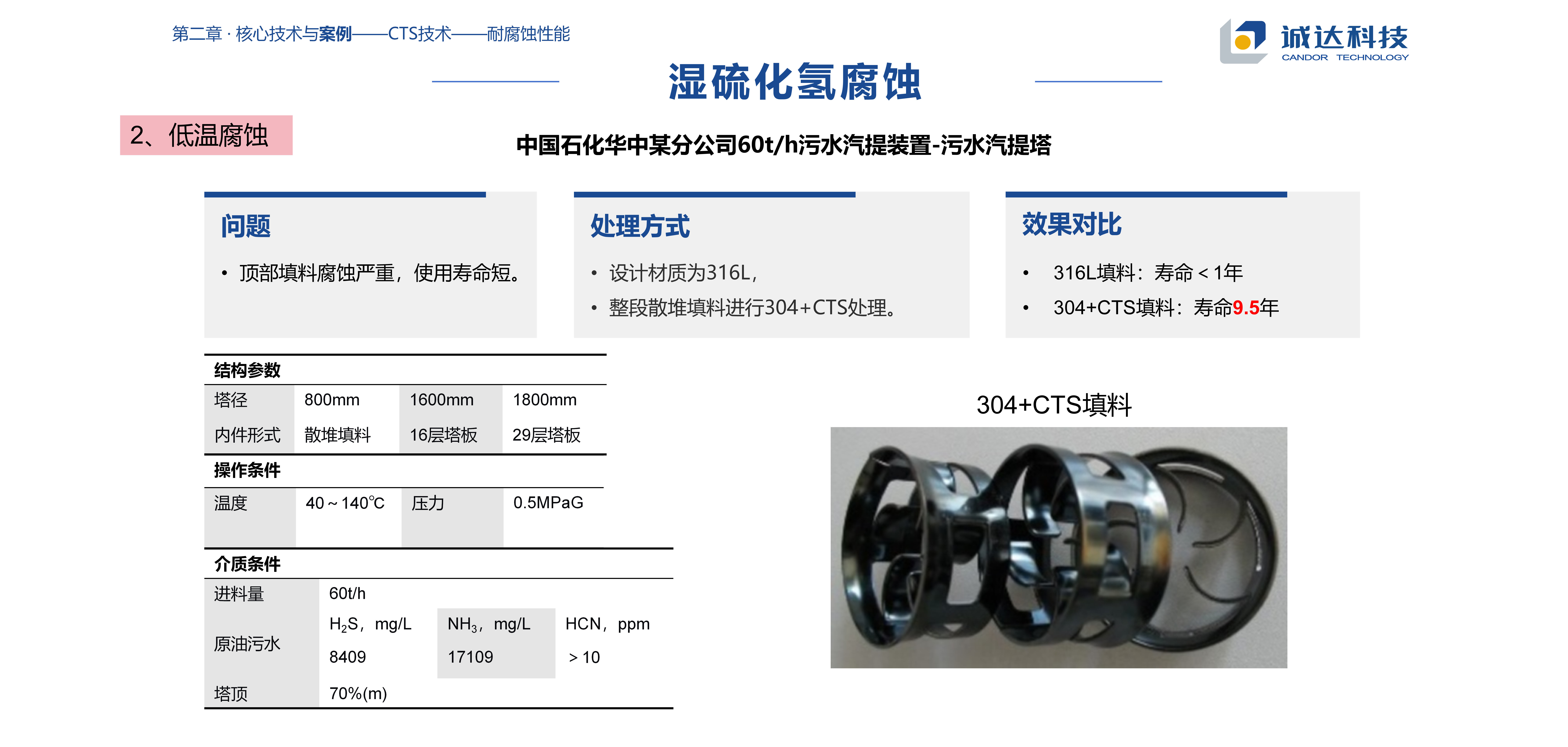 CTS技术是诚达科技独创的表面改性技术,是在低等级不锈钢材料表面,用化学和电化学组合的方法原位生成以氧化物为主成份的“超级钝化膜”。经表面强化后,各项性能指标得到显著提升,达到超级不锈钢耐蚀性能。实验证明,304+CTS的表面耐点蚀指数(PREN)高于双相钢和超级不锈钢;在三氯化铁腐蚀试验中,经CTS处理后,304/316L/317L/2205材料的耐腐蚀速率下降数倍。实践证明,CTS技术适用于高酸、高硫、高氯等严苛工况,并收获了丰富的成功案例。