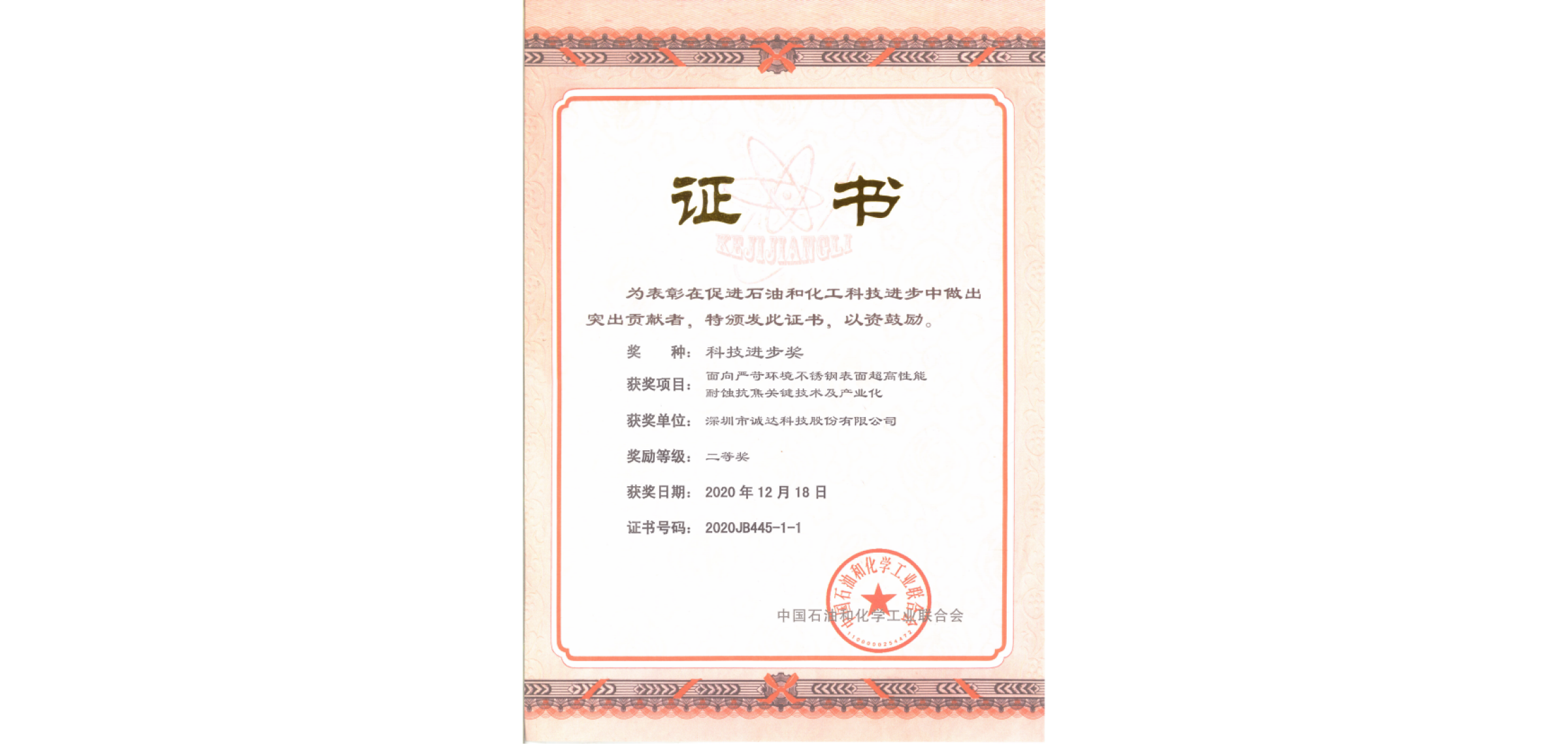 为推动我国石油和化工行业高质量发展,2020年12月23至24日全国石油和化工科技创新大会于杭州隆重召开。“面向严苛环境不锈钢表面超高性能耐蚀抗焦关键技术”荣获“2020年度中国石油和化学工业科技进步二等奖”。